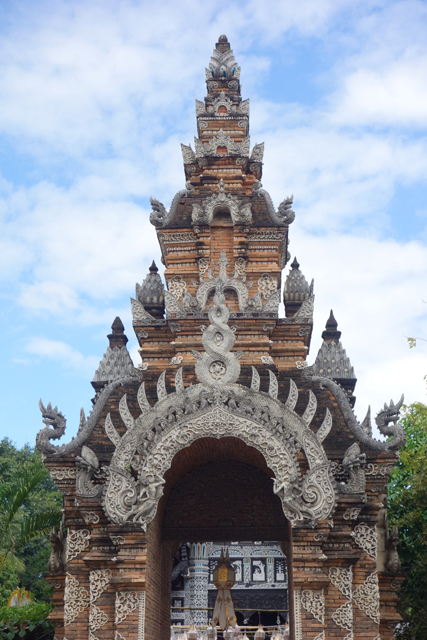 攜著飽足肚子離開旅館,目標是離我們最近的「羅摩利寺」(Wat Lok Moli)。它位處北牆之外,並不在古城內,大部分網路遊記也沒介紹,是不小心看到某篇文章的私心推薦,才特別於地圖上註記,果然循街幾個轉繞,遠遠便見一座精雕門塔於路邊高擎。順其招引走近,由塔尖的層層冠葉望至門額,它雖綻露一身磚砌結構,顯著歲月斑污,卻令外嵌的灰白雕飾更加輝華。花藤勾著門拱化為擺舞天女,納迦身鱗在交纏後擬作指天鋒芒,光是相遇的第一眼便令我訝嘆。
