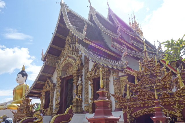 資料上說這座廟宇最早出現在十四世紀的典籍,由「蘭納」第六任國王「Kuena」所建,他從緬甸請來十位高僧傳法,以此廟奉之。當然木造建築很難撐過數百年的風雨,目前所見的主殿是近年的重砌,不過在那個時代,「羅摩利寺」是王室挺重視的廟宇,據說壇上那座金色大佛髮髻裡,就收有珍貴的舍利子,所以若周邊出現王家的敘事浮雕,也不意外吧。不免在跪坐祈語中多望了幾眼大佛,而當如此仰望,便發現天花板亦有別緻匠心,除了以框格在折曲中挑高、用團瓣伴飾菩薩騰遊與佛陀冥思,又嵌上五色亮片,隨著光影輝爍,便彷若教堂花窗引入的琉璃幻彩。