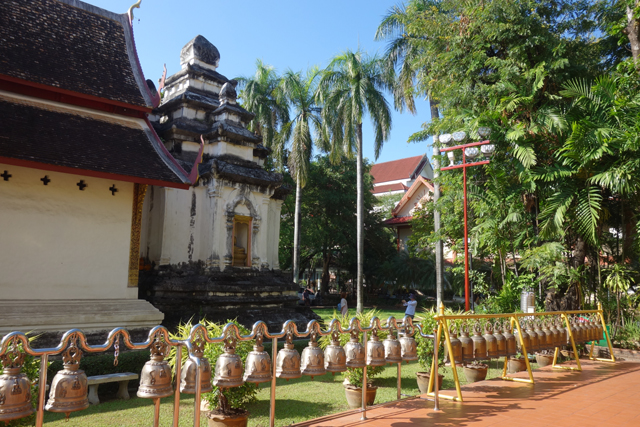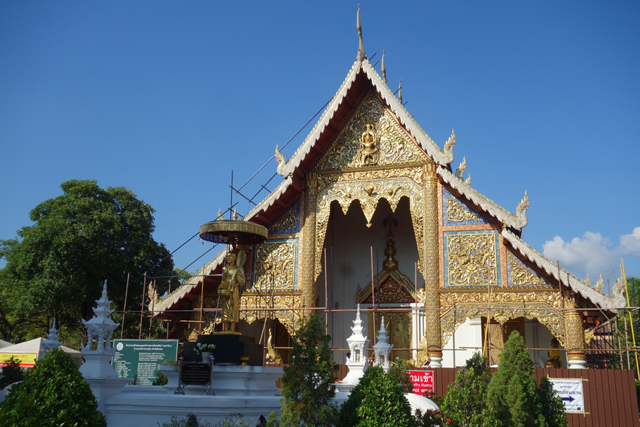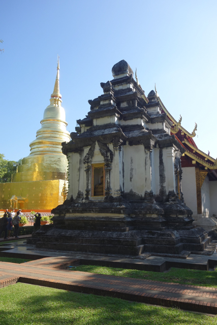 出去後望向佛塔,可能是有充足的信徒奉獻,不論正副,都以金漆塗抹得燦亮。但若拿掉這層炫惑,台座的雕琢其實滿貧乏,連馱象都僅一側一隻,瘦弱又孤單,受虐般顯得悲情。為什麼不把經費拿去請工匠好好設計一番呢?在挑嫌中我繞塔環行,根據資料,此寺砌建是因「蘭納」五代王「Phayu」想奉祭父親的骨灰,將副塔一一看過,卻很難辨清哪個才是為王室而存在,還是,根本不在這區?