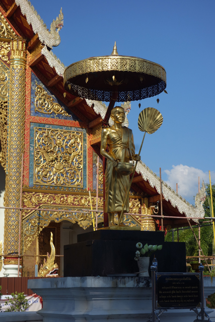 站於殿前的塑像並非佛陀而是老僧也滿特別,我好奇查了一下,居然是位被佛理耽誤的工程師「Kruba Srivichai」。他生於十九世紀,主導了不少廟宇的新建與重修,若再加上相關的鋪橋造路,數量可達百件,「帕辛寺」的佛塔與主殿也有其心血。
