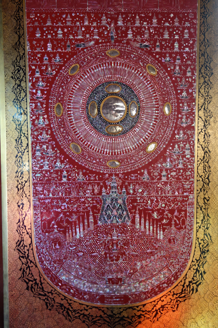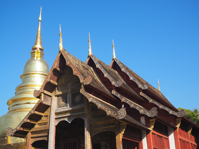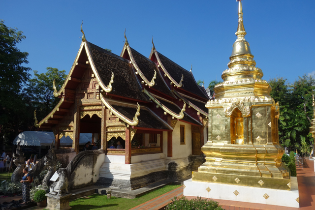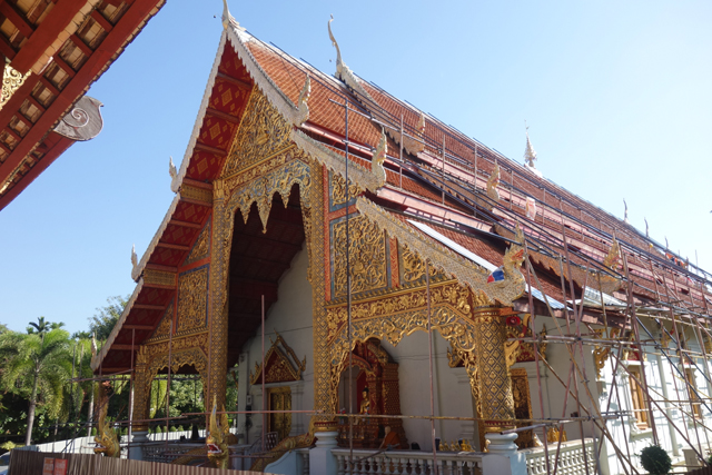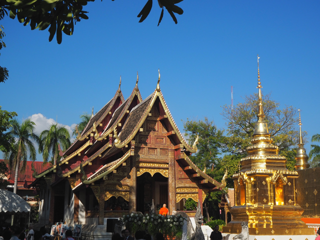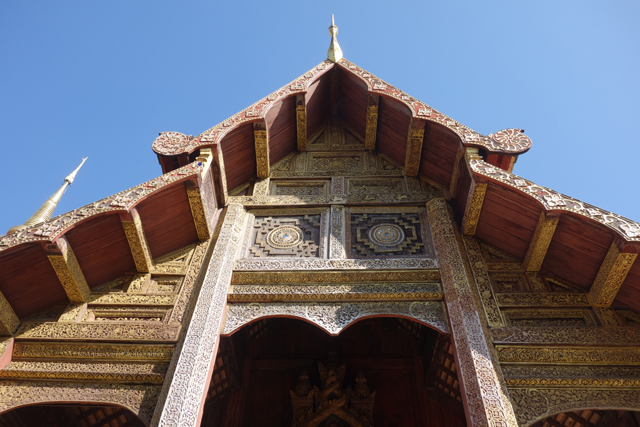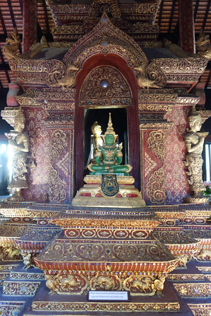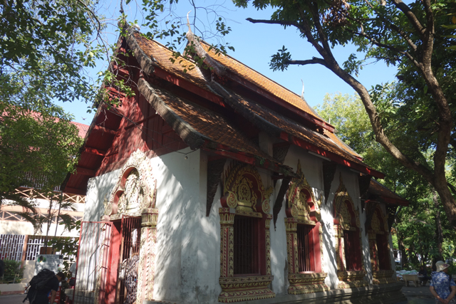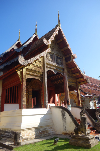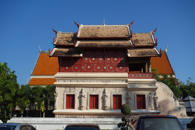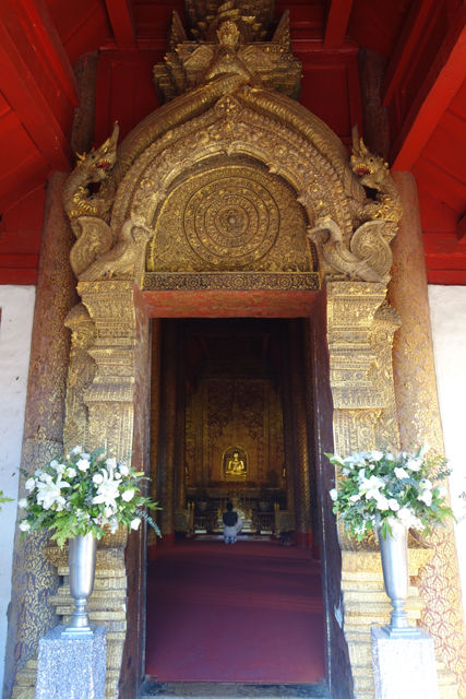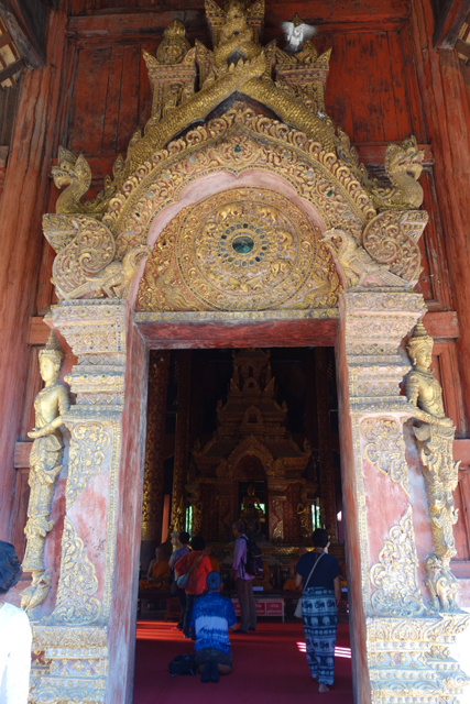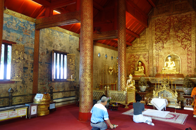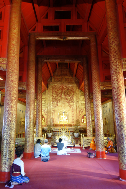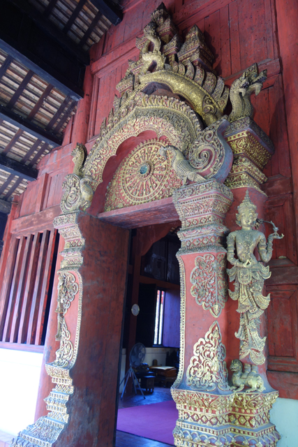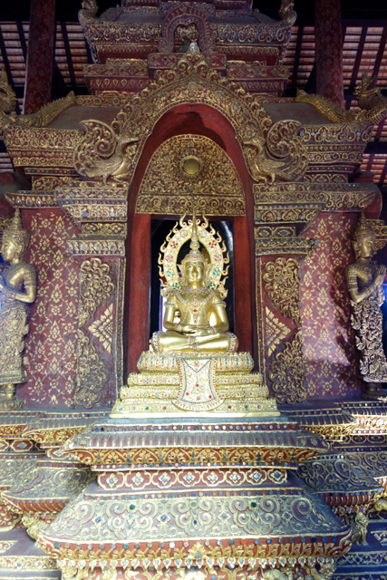 相對主殿,其門面雕鏤沒那麼簇密,留予赭紅格框去表現,然當邁步而入,便被內門華妝愣了眼,金色花藤循柱蔓生,在門額呈法輪開綻,周邊又以納迦、金翅鳥棲繞成弧,點出此殿的尊貴。會這麼說,是因裡頭供奉著「帕辛佛」(Phra Buddha Singh),來由雖不可考,卻的確有著數百年歷史,珍貴程度可與「玉佛」相比擬,到了「潑水節」,還會將其抬持遊街,與民同慶。原本這寺是以鄰近市場來取名,為了它特地改為「帕辛」,至於為何沒奉在主殿,可能是尺寸比例關係吧。