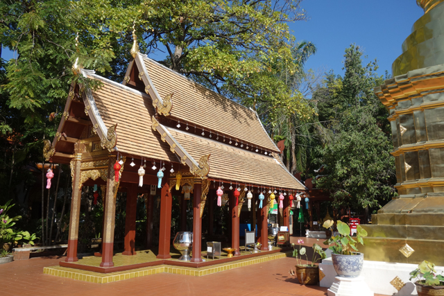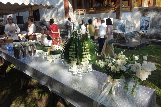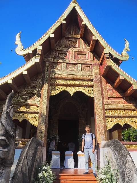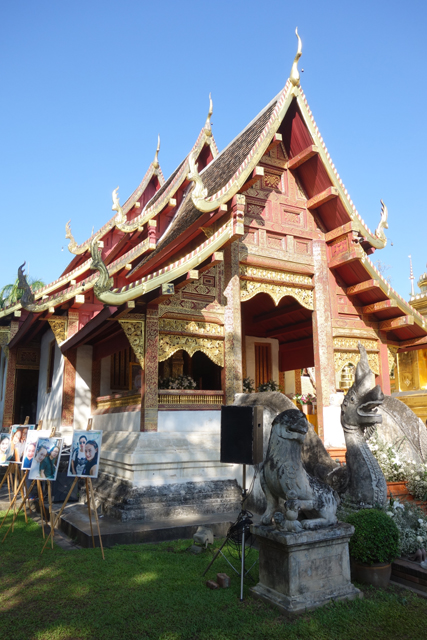 帶著滿滿問號走了進去,靠近佛塔的院落相當熱鬧,男女老少聚圍聊天著,可見照片、餐桌的佈設,還有潔白花陣指向一座小殿。這就是我被收費的原因嗎?但怎麼看都比較像即將舉行的婚禮,難不成要把一切歸結為被強索禮金。算了,懶得思考了,我趁著儀式尚未開始,趕緊湊近小殿,因為它可是院內的重點古物「萊康殿」(Wihan Lai Kham)。