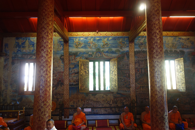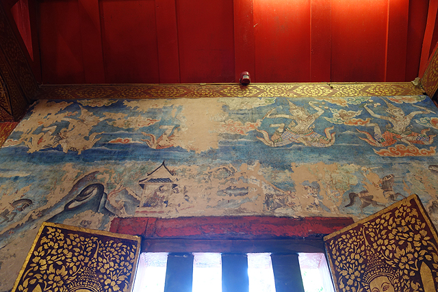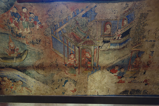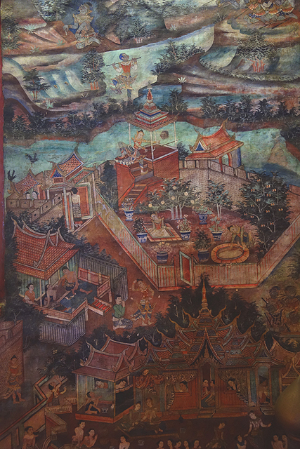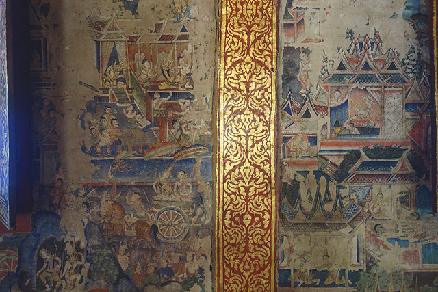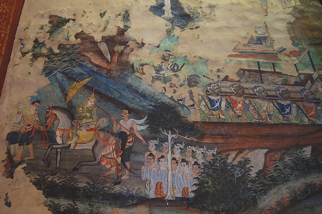 參拜過「帕辛佛」,我往殿兩旁望,不像主壁呈新修過的燦亮,側面壁畫斑剝得相當滄桑,認真細辨,上頭人物衣裝現著濃濃泰式風味,很誘人猜測是在描繪地方風土,答案卻不然。它們來由自《本生經》,一邊為「Suwanna Hong」,一邊是「Sang Thong」,前者我沒找到大綱,後者倒挺奇幻,主角是從蝸牛殼生出的王子,因泡過金色井水而滿身金光。
