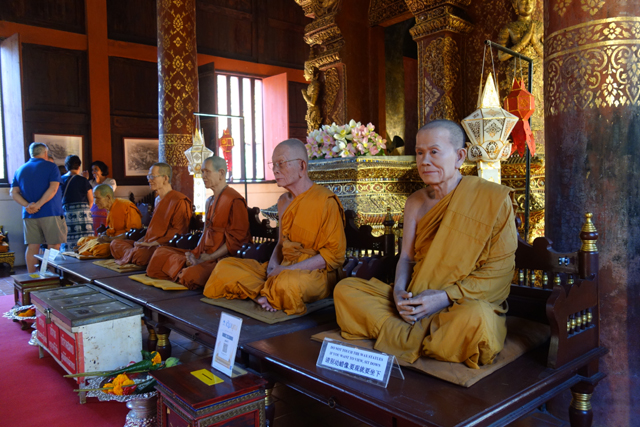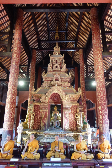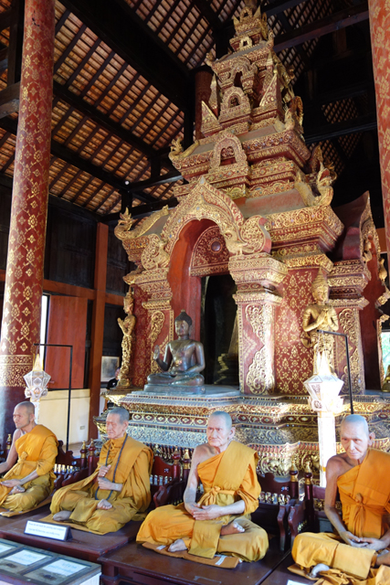 除了佛像的綴點,塔龕前也置了一列老僧,感覺應是對歷代方丈的紀念,這類蠟像在其他寺裡也有瞥過,或屬不太顯眼的伴飾,或以金箔貼得炫亮,此地的不僅醒目,且膚色老斑極度擬真,搭配那維妙維肖的容形,各自的表情氣質,有那麼一瞬讓我以為他們皆為肉身成佛,肌骨不壞,甚或懷疑其實都是真人,冥想完,就會伸懶腰站起,賞我們一個大大驚嚇。