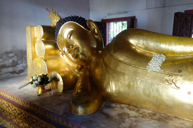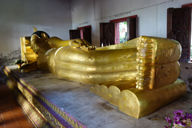 翻出自入口拍的地圖,寺區相當大,就算不計外環的學校與僧舍,也以滿多小建築散在院落等人探秘。像從祭拜佛塔的小敞殿朝旁看,「萊康殿」後方還貼著一座階狀的五層塔,簷面覆著風雨攜來的陳傷,它名為「Kulai」,建於「蘭納」十一王時期,所以也是值得敬仰的四百年古物了。從這兒再往後頭走,會遇上被林蔭遮掩的「Wiharn Buddha Sai-Yaas」,好奇走進,看似不起眼的它竟藏了一尊臥佛。從解說板看,它亦有數百年歲了,不知是否因著位置偏僻,維護順位較低,沒像別殿的同伴爍得金亮。但這樣的斑駁漆色反倒讓它透著歷史感,宛如涅槃後的塵歸塵、土歸土。