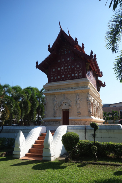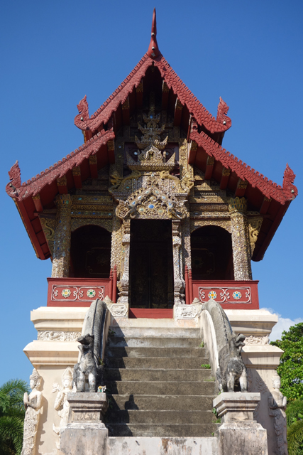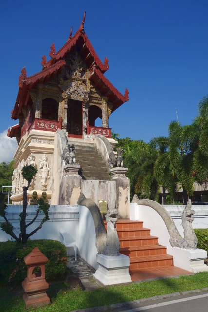 隨意望著其餘不知名堂的建物,從主殿另側回繞,這兒有座小閣相當醒目,抬升的基座周邊有菩薩浮雕羅列,閣前呈斷層式階路,能見怒獅居高衛守,比對過地圖,是「清邁王國」初代王「Kawila」主導砌建的藏經閣。這解釋了它奇特的高築,與刻意截去的階段,可是僅僅這樣真能防蟲鼠嗎?牠們攀爬的技術可高竿了,至於人,恐怕也只能防君子吧。
