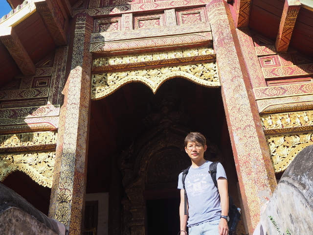 走了進去,立於殿心的是座「mondop」樣式的高聳塔龕,層層簷尾以納迦挑飛,鑲嵌拱邊燃成焰浪,除了龕內仿「帕辛佛」的小金佛,周邊亦有其餘佛像菩薩在花綻中繞圍,循其轉了一圈,才發現此殿是對稱結構,另端尚有格局相同的出入口。原來,這兒是有男女界分的,兩側分別配屬於和尚與尼姑,有點像過往看過的中式大宅,主廳鏡像般一半用於男主人迎客,背面留予女眷。不過那種在裝璜細部仍顯著尊卑,也隱著刻板性別基調,這殿倒看不出什麼明確差分,一如佛言中的眾生平等。