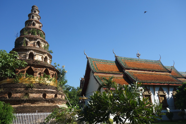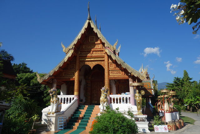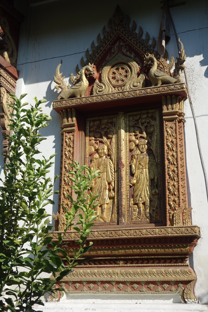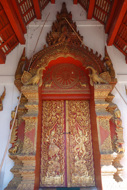 先遇到的是「Wat Phuak Hong」,可能是太早,抑或本就冷門,從石獅守望的外門穿進,僅見一個似乎就住在裡頭的男人在院子晃蕩。避開那有點詫異的目光,我往主殿望,它以典型疊層山簷張揚,暗紅漆色嵌著燦金紋彩,不知是否真混了緬甸血統,連在殿前護守的也是金鬃石獅。由於殿門沒開,我只能加減端望門飾,它承襲立面的色調,但紋綴又攀纏得更為華麗,中處是一對門神踩伏著縮頭惡魔,門額以鳥獸勾圍法輪,再往上繞捲成塔。