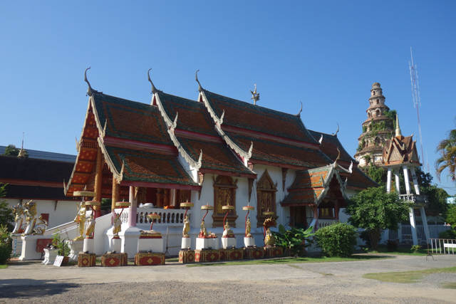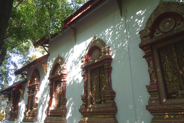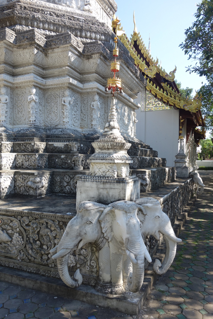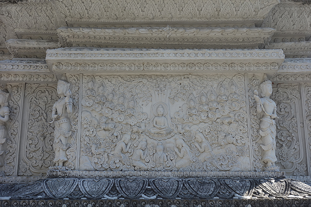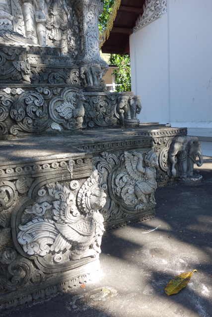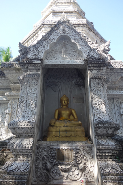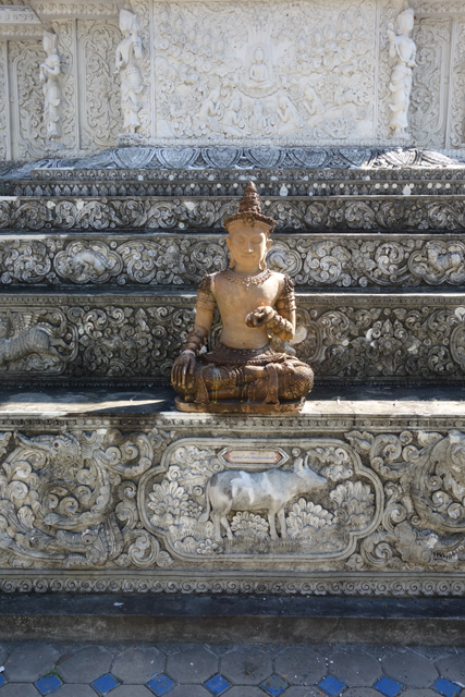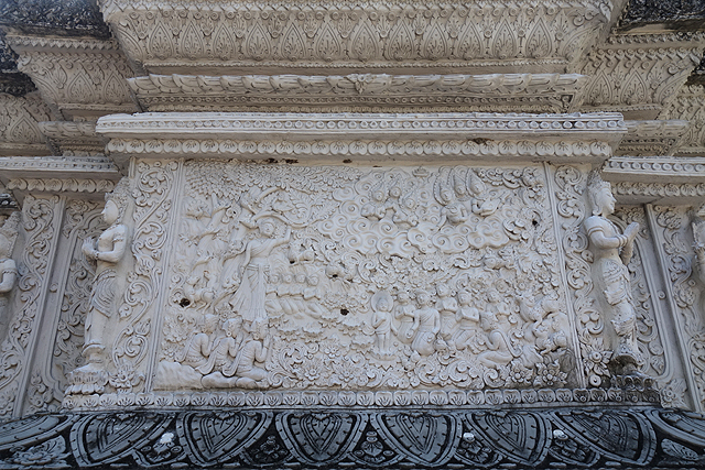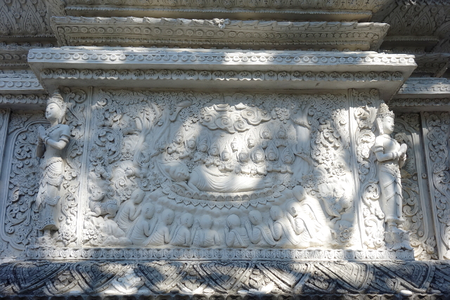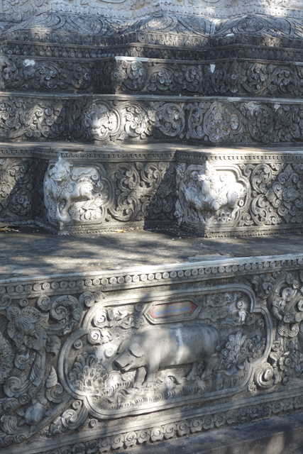 往東走,此區尚有間「Wat Pan Whean」,由於路線關係,先進入視野的是它的佛塔,而光這第一眼就令我瞬間怔愣,雕工也太繁複了吧。這幾日所見的廟宇多半把心力放在殿舍,佛塔皆用簡約線條來表現,頂多在頂梢、於嵌入的龕室作妝點,眼前這座則是從底座便以花藤框繞十二生肖。不僅最外的邊角有多頭大象,每個曲折處都有神獸從浮刻中探首,這當中不乏敘事雕繪,將佛陀事跡層層表述。眼花了好一陣,我才由面對主殿的龕室細細看起。