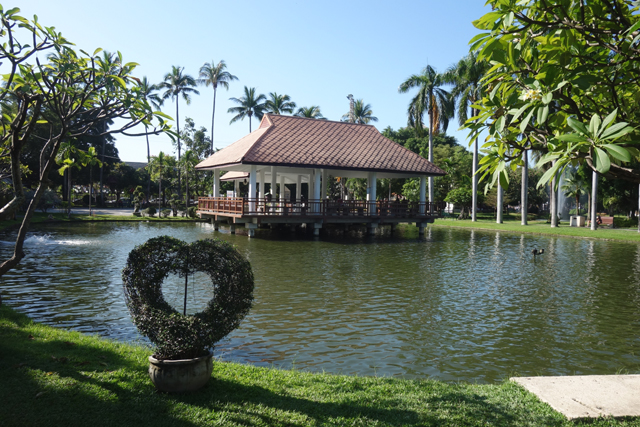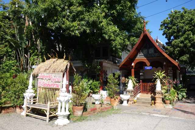 不禁把這名餵進google,有文章說此村名聞遐邇,不僅泰國全境,連國外廟宇都會特別下單指定,可惜在這大清早,整條街都門扉闔掩,無法找店進去驗證,是有某家在陽台擺置了許多刻雕,卻是木製品而非銅,唯一有機會見識的,應是「Wat Puak Taem」了。