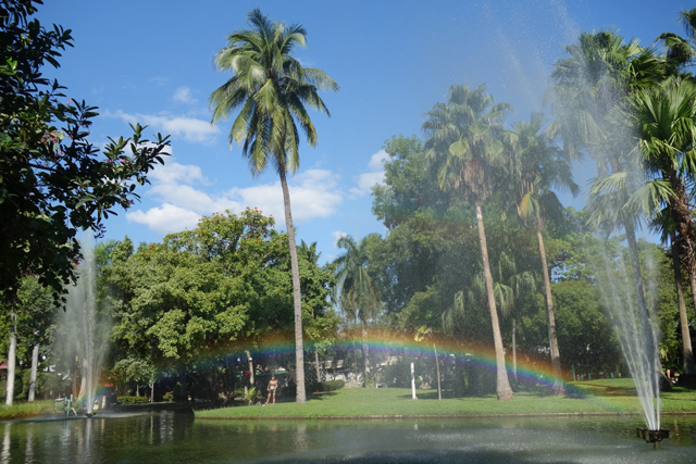 拋開這無解的疑惑,我出了寺院朝古城西南角走,那兒在google地圖上是公園,想著搞不好會有摻雜城牆殘段的景致,就過去瞄一下,反正順路,可惜當穿了進去,就是處綠意盎然的公園,沒見遺跡,亦無造景,僅有一些早起的女人在做瑜珈。但也不能說毫無收穫,因為失落的我正想離開時,竟瞥見大池中一線虹橋隨泉迸躍,在晨光映爍間格外耀眼,彷若是古城予我的道別。