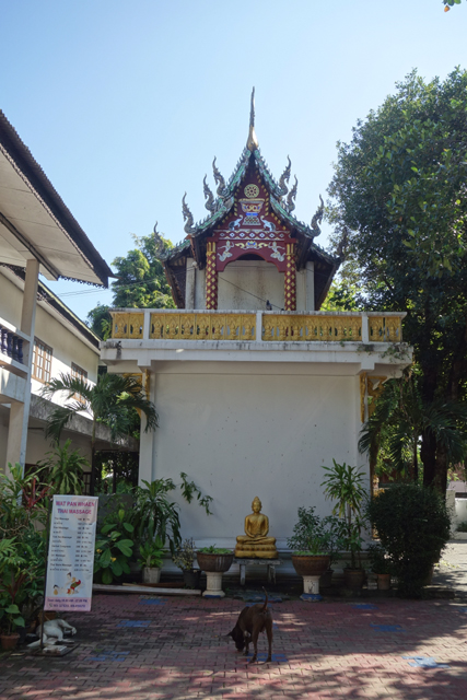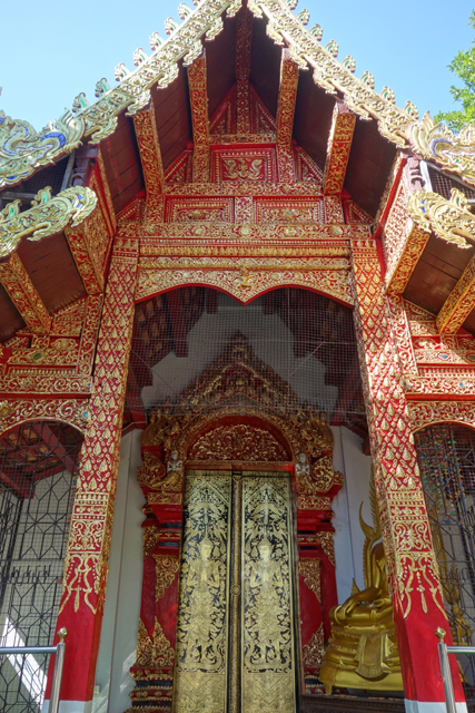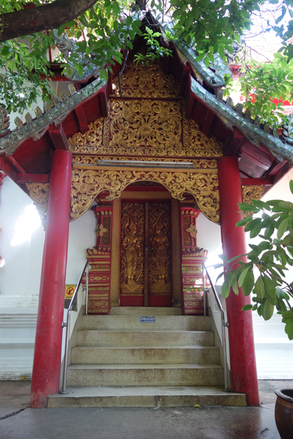 不過相對側門遞傳的視覺別緻,主門就回歸傳統了,纏紋雖照樣繁麗,紅底綴金的確亮眼,驚喜度便少了些,用相機記錄過,就分心朝他處望。這兒設有外門通往巷弄,小小的卻也飾上塔冠,有昂首納迦增添氣勢。不太清楚是新漆上得粗魯,或是近期改築過於求快,總覺得雕鑿沒有塔殿那區的細膩,若是後者,恐怕便是這速食年代難以擺脫之弊吧。