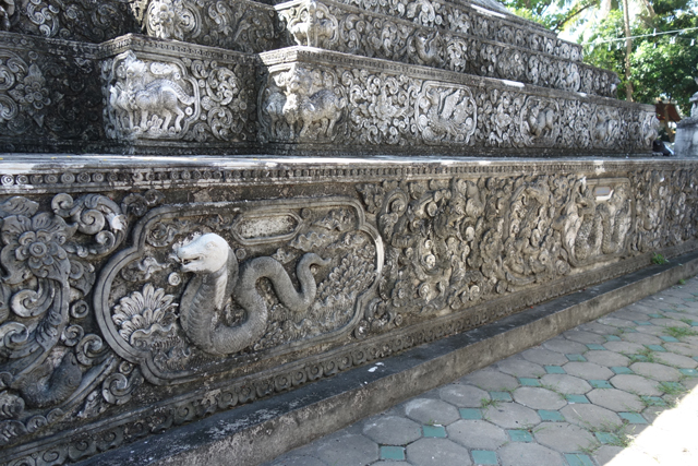 龕裡顯然是仿著悟道那刻,以菩提樹襯著肅穆金佛,楣頂柱框有花藤挑捲如翻浪。其餘三面為塔身主述,對側的雖同樣描繪悟道,場景元素卻簇密許多,能見信徒們低首合十,眾菩薩飛臨。相仿風格在左右重組為佛祖的出生與涅槃,前者於人物間綴上鳥獸繁花,顯得歡慶,後者則泛著祥和,接迎的菩薩們淺笑中似有哼歌。這些小小人像帶著童趣,牽引視線攀越各層葉浪,瀏覽佛陀傳道,頂端部分相當特別,居然在傘飾下刻了四面佛,不知是設計者的發想,還是引入何地風格。