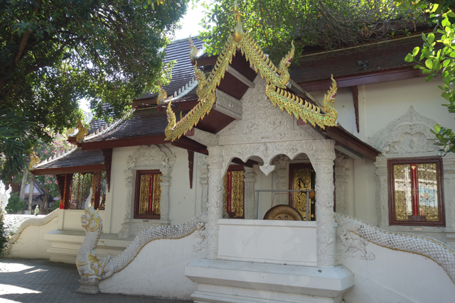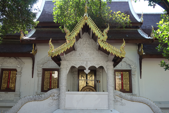 既與村同名,便等同村裡代表,何況這兒又主打廟宇妝點,照理該拿出認真手藝,將華炫景貌釘入訪客印象,哪知隨路尋去,望見的卻頗一般。不能說隨便,畢竟山牆飾板依舊藤紋盤纏,有階欄納迦引導視覺,殿門也於花叢中浮透半人半鳥的「緊那羅」。沿側牆雕窗往後走,素白佛塔在金邊勾繞之餘,同樣用繁複綴鏤將塔頂收了尖。然既自傲為藝術村,總該以銅雕呈現更多亮點吧,就像「素攀寺」,整座華麗的銀殿便是大型廣告,讓觀光客引入銀街商機,手藝也更有機會傳承。還是他們專精的只有祭壇小物,外頭雕琢不在業務範圍之內呢?