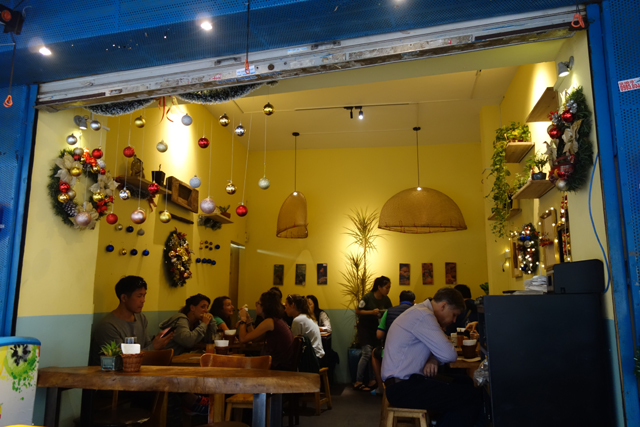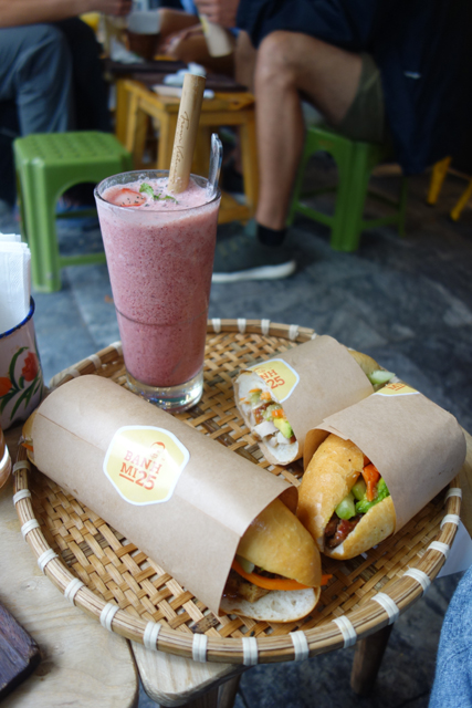 循著地圖指向,我在幾番巷弄彎拐後找到了它,可能是生意太好,原本的侷促空間收不了潮浪襲來的觀光客,於是隔著馬路,又闢了附帶座位的二店。正統的越南麵包除了肉跟配菜,會特別以「肝醬」(PATE)來增添風味,儘管前人都說沒這味就不算吃過,店家也以其為基底,在菜單條列了多種變體,對肝這字心懷懼意的我,猶豫過後仍選擇放棄,略過有標註PATE的品項,挑了豆腐、豬肉、番茄醬的保守組合。至於旅伴,一向喜歡酪梨的他,不意外點了與烤雞的搭配。