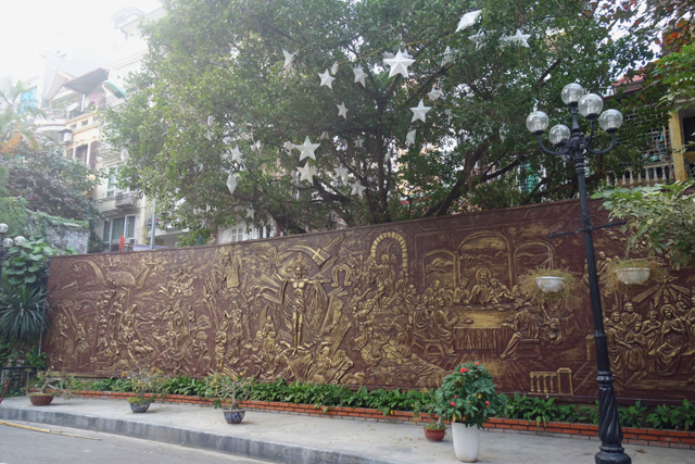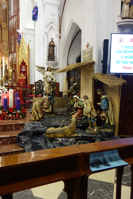 根據資料,這兒曾立著高聳的「報天塔」,為「安南」時代自豪的四大珍寶之一,可惜後來倒塌了,並在清除後淪為喧囂的市場兼刑場,而隨著時代更迭,現在雖仍充斥著人潮哄鬧,景致已迥然不同。因臨近聖誕節,廣場張燈結綵,除了聖誕樹,還設了巨大的造景雕塑,辨了一下,是很應景的「耶穌誕生」,能見小羊群聚、天使飛降慶賀。