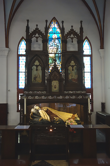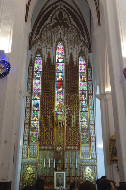 唯一能彰顯其「河內」總教區之首身分的,就是兩翼與殿末的祭壇了。即使壁面依舊只有狹長的實窗,卻運用了木雕圖騰織連,底部框繞為龕室,頂部飛騰成焰炬,再輔以蕾絲般的垂綴,就形如一幅巨大花窗,將視野繽紛炫亮起來。一般都是將基督奉在中位,這兒倒將其與聖母置於左右翼,主壇上是被視為「河內」主保聖人的「聖約瑟」,他抱著小耶穌,以慈愛表情凝望。