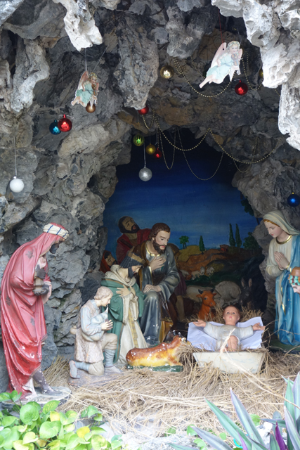 盯了一陣主祭壇座的堆疊,與其間金紋如藤的蔓生攀纏,我將目光移向邊角,那兒另有一區應景雕塑將時序推進,小耶穌雖沒現身,依訪者迥異的衣飾,應就是三賢者持黃金、乳香、沒藥,遠道來朝。再順路瀏覽著廊間的聖母小祭壇、教堂模型,我們出殿往環道隨意走探,相較主體的無華,外牆反倒多了蠻多不同風格的創作。除了三賢者望見「伯利恆之星」劃掠的圖繪、馬槽石窟的造景,尚有金漆塗抹的大型浮刻,一側述著降生與「約旦河」受洗,一邊顯然是騎驢進城及「最後的晚餐」,中處則將釘十字架那刻轉為昇天的耀光震伏。