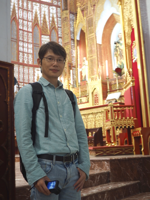 走了進去,不知該算幸還是不幸,居然遇到有人辦婚禮,座位都被結上潔白的花球,沒多久也看見新人從門外現了身,相互勾著,綻揚幸福笑容。因著後續的儀式進行,我們無法大剌剌在中殿拍照,只能匿往側廊,低調抬望,偶爾偷按快門。一如立面的簡練線條,堂內也沒以繁複飾綴去經營,素白刷色佐著暗金肋拱勾邊,兩側是嵌了些多彩花窗,相比歐洲整面廣幅的繽紛堆架,便遜色許多。