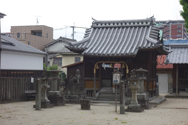 愣了幾秒的我望向它對面的一方小空地,由標牌可知是敬著「素盞鳴尊」的「八坂神社」,日本的「八坂神社」據說有三千多間,我也曾在京都拜訪過總本社,因對神社的初體驗而記憶深刻,這間算很迷你的了,烏沉身袍與墨色簷冠,孤孤單單地,只有兩隻狛犬相伴。
