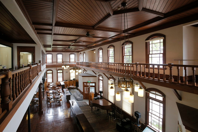解說板寫著古賀家在式微後曾被他人接手改裝為餐廳,有著不同的增建與隔局,為重現最初的模樣,有關單位特別作了考據還原,而除了眼前可見的正廳,西側尚有茶室,及以「土藏造」型式砌建相對防火的廚房。然就這樣深入探索好像怪怪的,我們便只在正廳周邊走晃,看看隔欄簡約卻雅致的雕花,由環廊瞥望後院風情另具的樹石散聚。