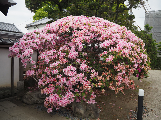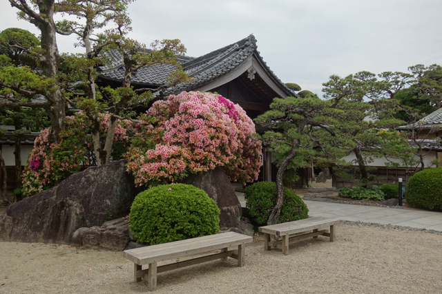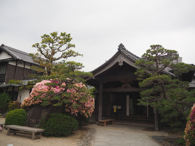 古賀一脈估計是這地區的首富,除了銀行,也留下隔鄰的老宅,以「舊古賀家」之名同被收為民俗館的一員。攜著小簷的長牆、格狀鑲拼的牆板、隱隱透現的院林,從外觀就能感受曾經的顯貴與洗盡鉛華後的不問世事。由於大門開敞,我們便走了進去,園子裡果然林葉扶疏,在修剪打理後,以一簇杜鵑花聚焦視線,儘管已屆花季末,搭襯背倚老樹的蒼勁,仍令人駐足端賞。