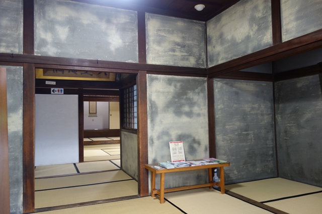 步入玄關,望見的是灰白刷色的斑駁空間,榻榻米倒是簇新,自由參觀嗎?我們面面相覷有點不太確定。嘗試往裡多邁幾步,好像真的沒管理員,等望之間,就不禁把相機端起來拍照了。它看來是往兩側延伸的佈局,屬於在武士貴族階層流行的「書院造」,中央正廳一如過往所見的和式屋房,有層層拉門隔分,依照需要或閉闔成為私密的一間間小室,或全部推敞轉為寬廣的大宴客席。拉門上的襖繪是觀賞重點,可見墨色山水搭配詞句抒情,也有些成為書法、長幅畫作的展示屏,年代作者自然無法得知了,那些跡殘色褪的八成都是珍貴古物吧。