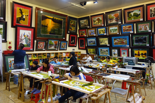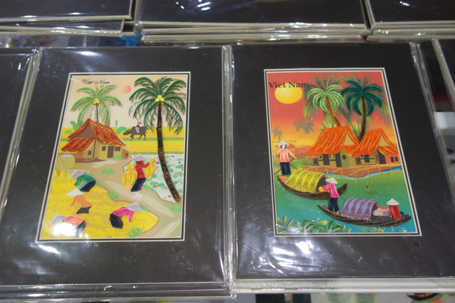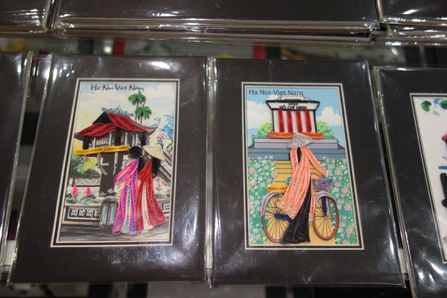 隨車往南,由於名勝群所在的「寧平」距「河內」幾乎有一百公里,中途便穿插了休息站,美其名給我們解放、參觀織繡現場,想害人破財才是真。我隨興逛著商品,雖不想給商家輕易得逞,當瞄到沒在別國看過的書籤,仍覺得新奇。紙片先用彩繪打底,能見百姓農忙與運貨舟艇,以及「胡志明陵寢」和「一柱寺」這樣的景點,然後他們會把色帶圈捲拼組,當作另一重的上色,也讓圖面立體。