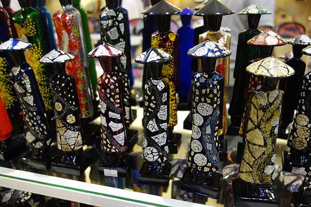 購買慾騷動之際,又有一區木雕將我勾住,它們以越南女子為題,戴著斗笠,穿著類似旗袍的傳統「奧黛」,儘管線條簡約,色彩卻相當繽紛,佐以石紋冰裂圖騰,登時讓我看花了眼,好在放風時間有限,不然錢包就要打開了。