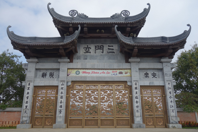 我抬頭往上望,門額以中文書了「三門空」,指的應是佛寺慣常的規制,綜納了「空門、無相門、無願門」,當走進了,放下了,便能獲得解脫。只是這字體歪歪扭扭,我來寫肯定比較好看,且旁襯的「解脫、安樂」,有從左書寫,有從右的,在這兒要找到具備基礎中文素養的人有這麼難嗎?另個值得玩味的點是,越南明明已推行拼音字,大可另闢蹊徑,卻彷彿已被深深刻印了,覺得這樣的字形與廟宇才搭襯。