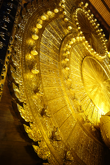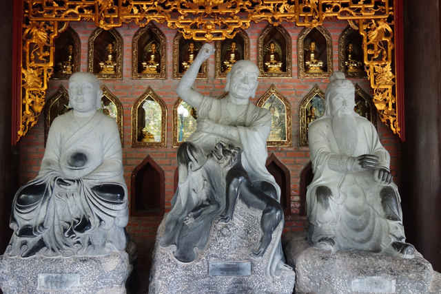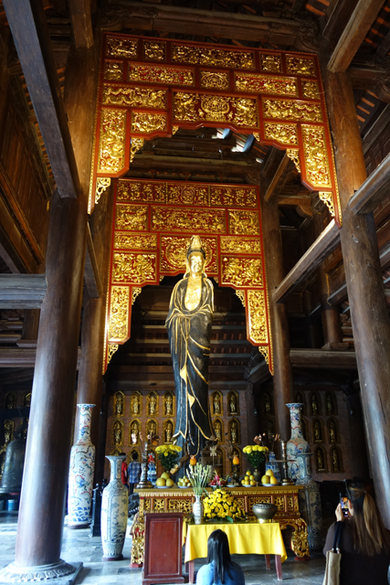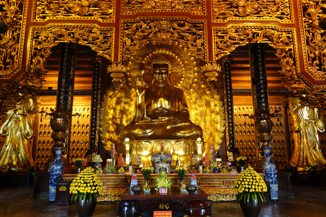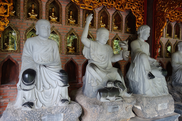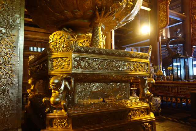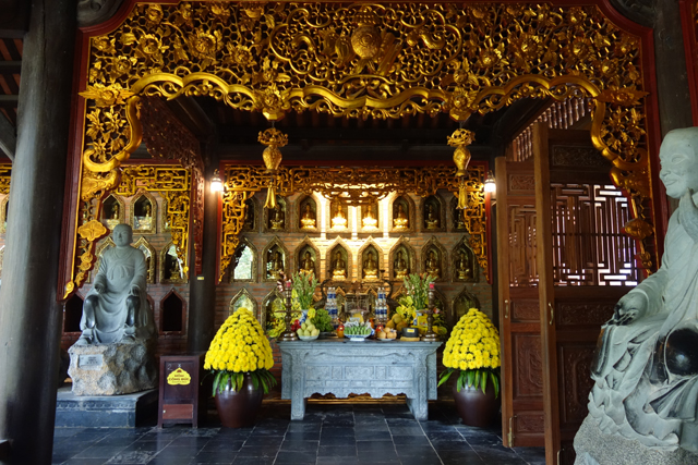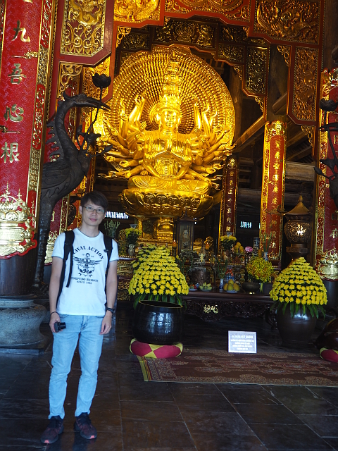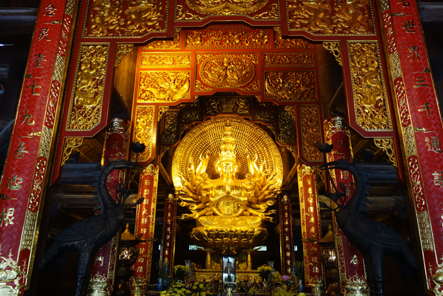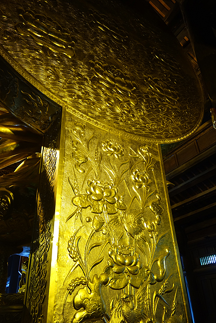 走入殿門,裡頭柱間同樣有金炫雕板拼接延展,細節上則相對陽剛,挪去天女歌舞,改以龍形的各樣翻騰。主壇自然是釋迦牟尼了,背襯的輝耀光輪可見一個個小佛綴點,左右有老少弟子伴侍,年長者為「迦葉」,年輕的是「阿難」,再往旁的,就難以辨識了,想猜是四天王,卻偏偏有八位,配件也缺乏最好認的小塔跟琵琶,只能胡亂歸結為越南的異化。