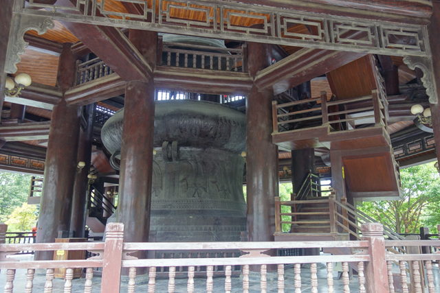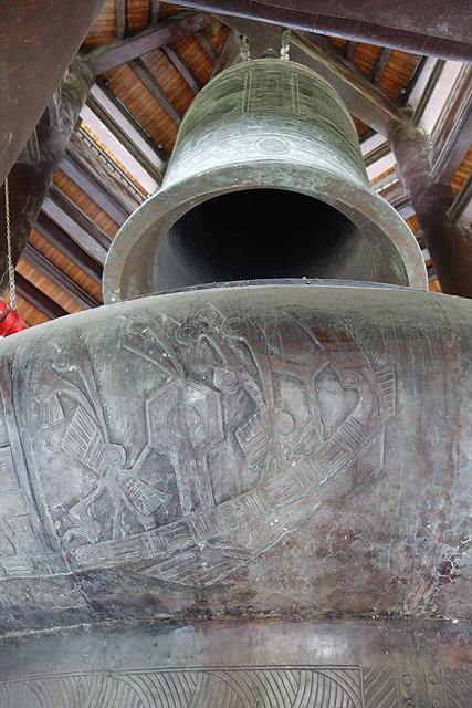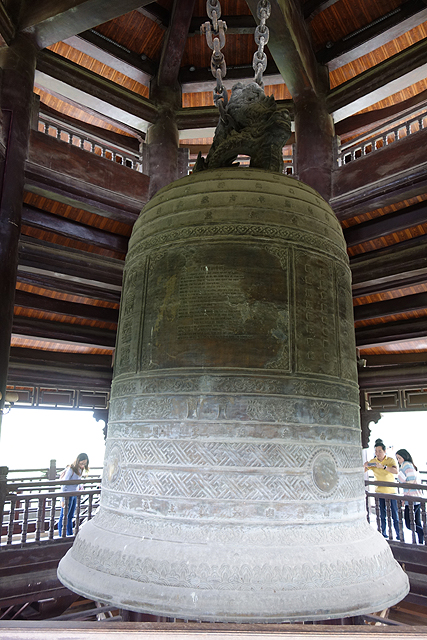 拋開無法得到解答的疑惑,我把視線往上挪,眼前據說是越南最大的銅鐘,鐘面紋刻偏向傳統,流雲花藤外,尚能看到中文,連類似小篆的字形也出現了。本還想著莫非真的是珍貴古物,當瞄到「幽冥教主」這樣的字眼,就把這可能性捏熄了,眼前出現一幅畫面,是鑄鐘師隨機抽書翻頁,見啥刻啥,想反正當地人沒幾個看得懂。
