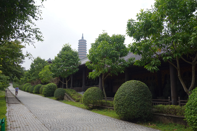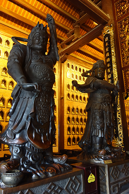 轉過身,在此起始的中軸線有挺傳統的配置,先以長橋劃過一汪池水,然後是照壁半掩的內山門。照壁隱著龍鳳翔飛雕紋,中處與後方門樓皆有花窗相呼應,曲折成峰的簷線往旁延展,帶出一塔於林後銳尖挑飛,頗令人揣想登高能收攬的景致。跟著大隊走入門樓,兩側奉置了類似「哼哈二將」的大型雕像,但是以一文一武的形象呈現,隨其上望能看到層層梁架在斜簷下的撐托,雖是近年所築,卻莫名泛著陳舊古色。而由此朝旁側迴廊拐,就是寺裡知名的五百羅漢陣列了。