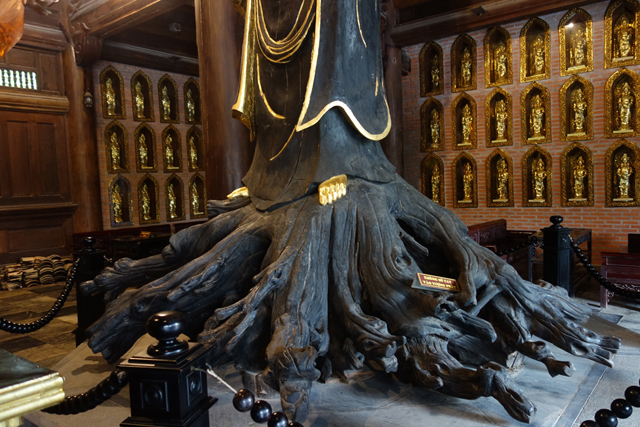 相較主壇的氣勢奪目,兩側副壇改換了路線,鏡影般互望的觀音相當高,有著頎長飄逸身形,雖刻意以墨衣歛了光芒,趨前細看,便能察覺其低調中的匠心,因為底座是樹根啊,意味著都是以完整樹幹刻雕而出。而當循其身姿敬嘆仰望,視線也不禁駐留在頂頭桁架,直覺以為會承襲著中式工法,但也不知是為了速成或早分了派系,顯得相當素簡,不施以藻井可解釋為營造空闊感,最典型的斗栱卻沒見幾個,樑柱就是直接交互穿插,與繁雕飾板形成極大反差。