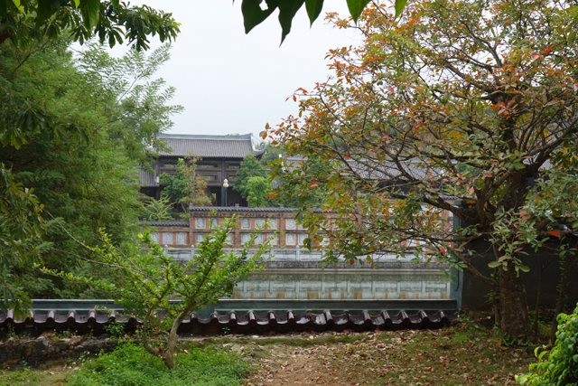 下樓回到院落,或許覺得再走羅漢長廊我們會膩,這會兒導遊領的是林苑間的石板路,雖無繁花添色,對我這種不愛爬階的人也算好事,畢竟寺區越往裡處地勢越高,環廊可是以層層階台上攀的,漸升的坡路較能欺騙感官。沒多久,步道匯聚於另個中軸廣場,帶出「觀世音殿」的揚展形貌,除了量體相當長闊,它跟概念裡的中式佛殿沒多少差異,重簷歇山頂,木色樸樸拙拙的,僅在窗框簷下勾了幾許流雲綴邊。
