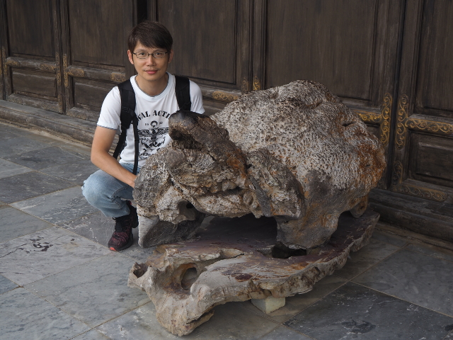 一邊研究台側原始部落風的刻紋,一邊順著環階往上爬,由高處看,這東西是填實的,並於頂部飾以更多鳥獸,縱使裝不了東西,仍有不少信徒往那丟了銅板,彷彿當它是個聚寶盆。不過當答案揭盅後,也不算太意外,因為它是個銅鼓啊,在對應上合情合理,就不知這鼓型是承自何流派了。