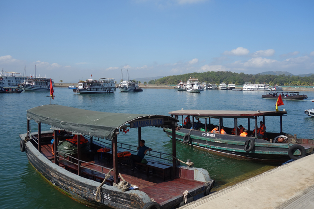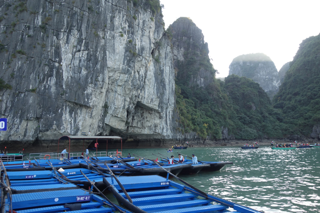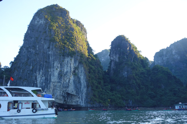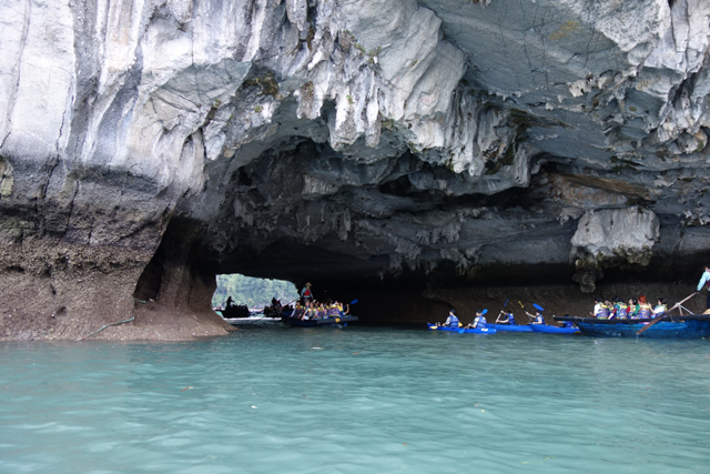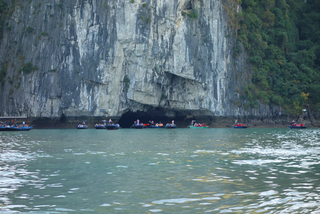 離開「英雄島」,表列的下一站為「Luon Cave」,中譯是「穿洞」,也有人因其隱匿稱之「神秘洞」。諸多遊船極具默契,都緩緩往同方向靠攏,那兒島群如連綿山脈,間或有奇峰高聳,不過靠去顯然不是為了讓大家近賞,而是藏於峰底的低矮穴隙。