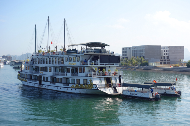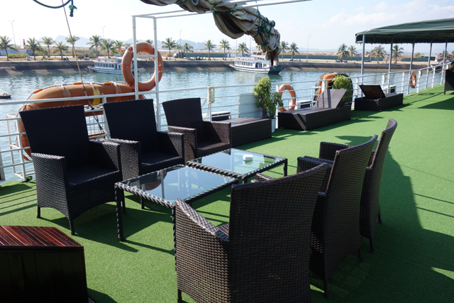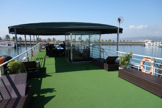 把他當空氣眼不見為淨後,我在港口逛晃,畢竟船家為了利益最大化,時程控制得無縫接軌,得先等他們出現、緩慢送走前一批客人、整理完艙房,才輪得到我們,且上去的還僅是接駁船。這令我在上船後不禁往外張望,因為有些團會詳細標註船型,或氣派、或雕琢、或走古風,偏偏我選的這團描述得挺模糊,逼人在瞎猜中心情忐忑,看駛向破爛的,就隨之緊張,若與豪華的錯身,便一陣悵惘。結果最後揭盅也不能說意外,它普普通通,滿符合這方案的價位,勉強可說嘴的應是船頂甲板吧,鋪上綠毯、擺置躺椅,努力營造了慵懶氛圍。只能跟自己說,本就不是來灑錢享樂的,整體乾淨舒適就好。