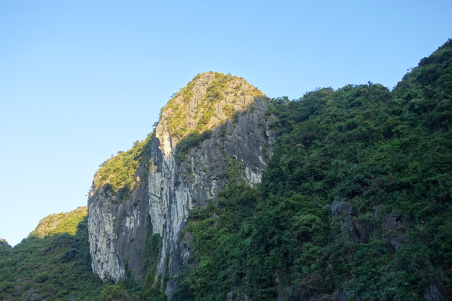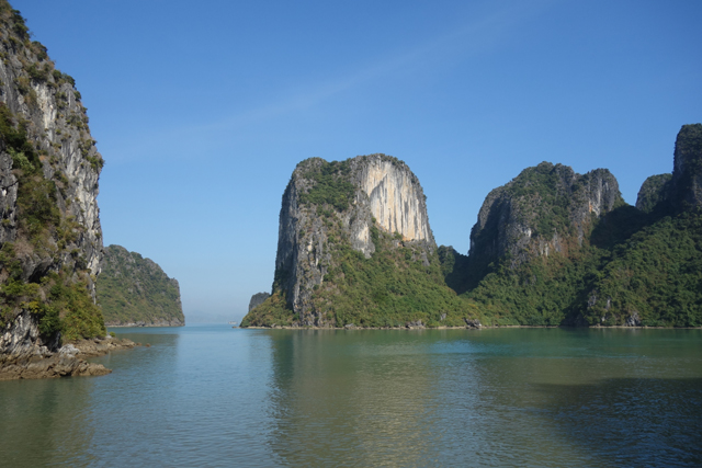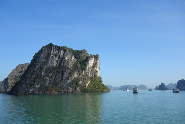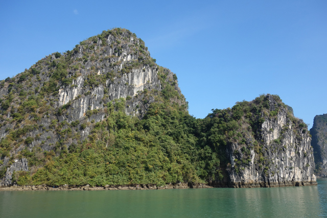 一面吃著,一面瞥著窗外徐緩變幻的海景,而當島身漸趨壯偉,便開始覺得玻璃反光挺礙事,想菜都上得差不多,不會再有什麼驚喜,就拎起相機走去甲板,不管胃晚點會不會抗議太空虛。甲板果真風光好,明晰且開闊的視野頓時令人神清氣爽,能靜心賞看島群的形姿嶔崎。它們有時孤身,如斧刃劈削過的奇峰於海中傲立,有時又相互交錯接連,疊嶺般將闊海環圍成湖。且因著石灰岩質的特性,易溶蝕、易崩塌,在海濤的撲擊雕鑿下,便都有著曲度甚大的輪廓,