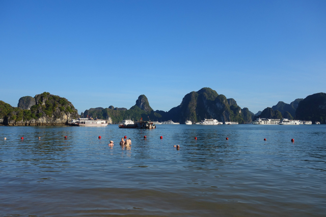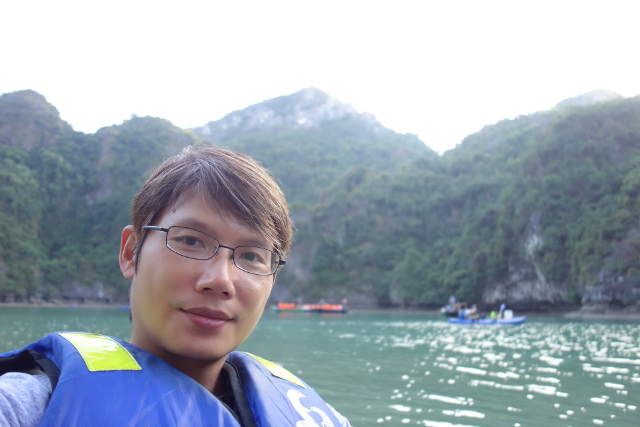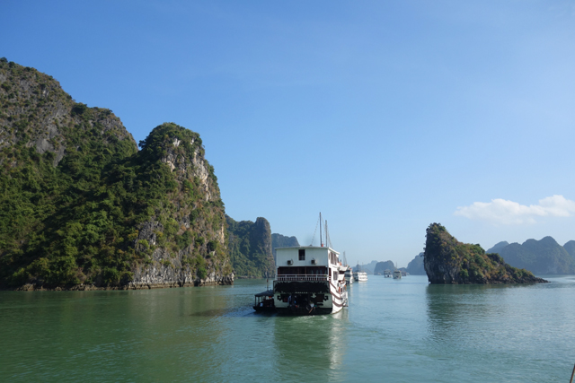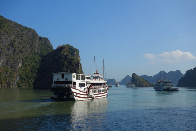 當辛勤自拍著,不免也瞄見週邊錯身的各艘遊船,就像覺得別人桌上的甜點比較好吃一樣,別人的船也比較美。它們或添附龍形飾板,或以繁多盆栽妝點,有的還在甲板頂砌了挑簷小閣,還好沒遇上某文案標榜的仿古遊船,不然我肯定跟灰姑娘一般,自慚形穢。比較之際,「黑毛」跟另兩個女生出現了,聽起來「金毛」已昏倒在房,緩慢回血。而他們的聒噪交談雖有些破壞賞景氣氛,換個角度也算救星,我趕緊把臉皮加厚,上前幾句搭訕,將相機遞給「黑毛」,免得整趟「下龍灣」只留下歪斜自拍。