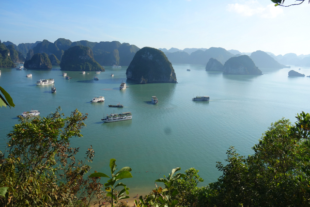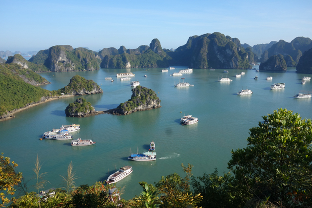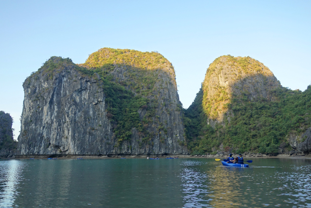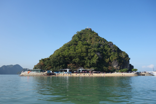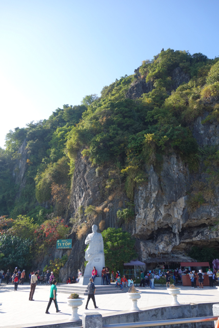 幾次快門之後,岩群間冒出一座吸睛島嶼,稜線如精削過,一側陡峻另側稍緩,再加上灘岸滿滿的人點,顯然就是來此都會排入的「英雄島」。它的英文名稱為「Ti Top」,會這樣取是因俄羅斯太空人「Gherman Titov」曾跟胡志明來過,中文以英雄譯之也算貼切。但觀光客當然不是來致敬的,除了作為調劑,免得望海望到放空乾脆倒床到入夜,也是為了其登高收攬之景。