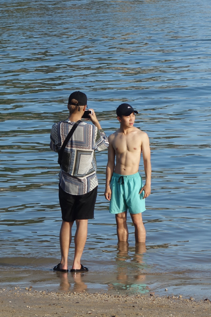 解決了拍照事,便可再次靜心倚欄,將島群們一一勾勒,賞望其間的聚散,待了好一陣,直到集合時間將屆,才割捨了這片瞰景,下山在島緣走晃。這兒據說是海域難得的沙灘,因此能見不少外國人脫了上衣直接穿外褲下水,還有像在海裡偷偷脫光的,裸現的股溝很費疑猜。掃射中,又瞄到了黑金二人組,「黑毛」瘦瘦的,怎料竟有偷練身體,自信地半裸拍起寫真集,遠距離都能望見胸腹的肌線。全程掌鏡的「金毛」相對就沒這興致,他大多時間都包緊緊,應該沒在練吧,也是,靠臉就夠了,何必多花時間操勞。