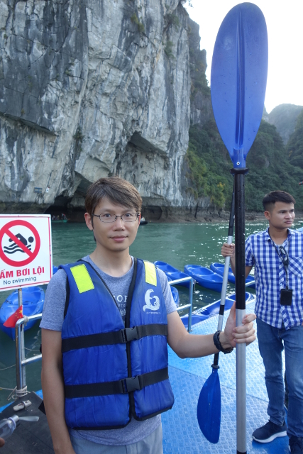 遊船碩大自不可能直駛而入,鄰近設了渡口,得在此轉駁,船家提供了兩種選擇,給小艇載進,或兩人一組自己划獨木舟,為了樂趣,青壯組都不約而同選了後者。至於冷戰中的我們,由於無法商量,只能互相對視,好笑的是居然就這樣用眼神達成協議,自動走去青壯組,又默默幫彼此拍了打卡照。而船家也挺相信大夥的平衡感與技術,什麼提點教學都沒,救生衣船槳分完就號令出發了。