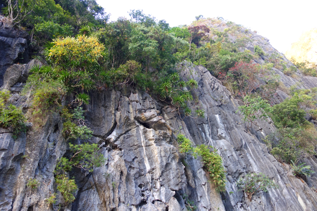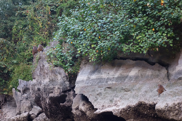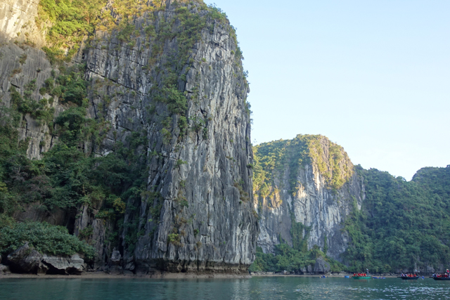 沒聽導遊說何時集合,所以就慢慢邊拍邊划到了湖對處,在這兒入口石隙變得好微渺,山壁也在身側拔尖壯偉,這算是首次與「下龍灣」的島岩近距相望吧,我在仰抬中盯著禿岩上的頓挫紋理,臨摹般抹繪著水墨中的斧劈皴,也感嘆林樹竟能在這些絕壁微隙抓根茁壯。奇的是,猴子居然也在此繁衍成家族了,不時有幾隻從林葉間蹦出,懶懶對我們瞥望,源頭是從哪來的呢?古遠前島域還與大陸相連時,還是藏在貨船被發現然後放生?