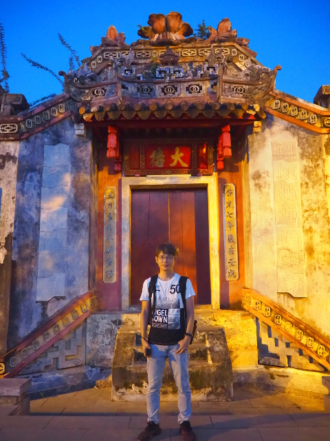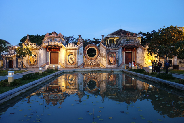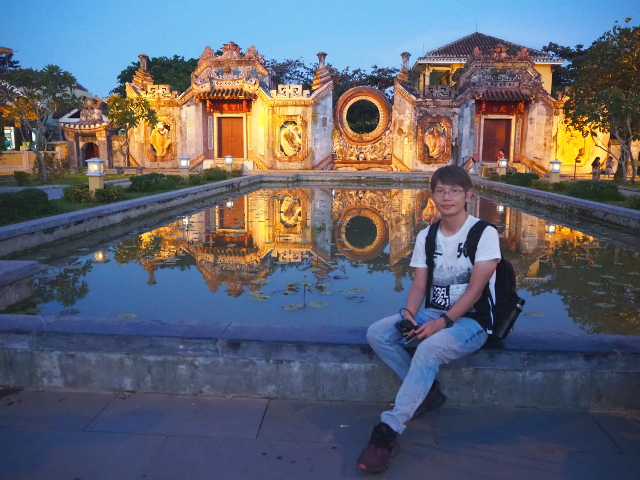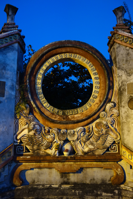 會是種鏡花水月的意象嗎?我端起相機,拍了幾張它與池鏡化形的雙生世界,感受因打燈而漾散的神祕氛圍,然後順其招引走近,但很詭異,洞後似乎就僅一排林樹,看不出另有什麼建築。百思不得其解的我僅能在閉鎖門扉前端詳,看牆面彷若大型瓜果的雕鏤,以及於簷上歡綻的蓮瓣刻綴。事後不禁多查了一下,原來它是「The Ba Mu Temple Gate」,似乎還有個「和平宮」的前稱,主祭媽祖娘娘與保生大帝,曾經殿閣連綿,只是因著戰禍,現在僅剩廟門及外院,以努力修復的雕琢,供遊客們懷想過往的華美。
