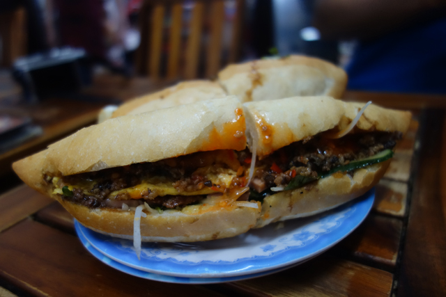 從殘遺池牆續往北走,由於遠離河岸,街區顯得靜謐許多,建築也較稀疏,直到接近這家「The Banh Mi Queen」,才又熱鬧起來,能見其攤前被慕名而來的觀光客圍聚著,幸好店裡尚有座位可供歇腿。相比「河內」那家品項琳瑯滿目,這邊僅豬、雞、蛋、素食、綜合,五種可選。牛以外都不挑食的旅伴很快點了招牌綜合,地雷很多的我由於對肝醬「Pate」仍心懷忌憚,有點想選素食,偏偏這款的材料挺陽春,就決定挑戰一下,勾了含醬的煎蛋麵包,