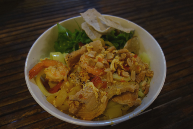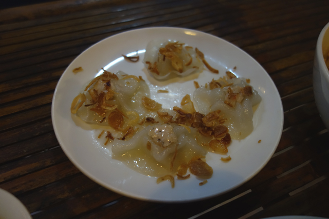 此地主食一般首推「高樓麵」,為肉菜相拌的乾麵,有這怪名,據說是當年商人會在樓上邊吃邊監視有沒有人偷貨物。然根據網路的描述,那麵有炸豬皮,感覺很恐怖,就選了安全牌「廣南麵」。它來自「廣南省」,有肉有蝦有配菜,與灑上的蛋碎和花生同食,口感相當豐富,調的醬汁也不錯。主食之外,搭配沾醬的炸餛飩也是這兒特色,由於很多人說其實滿普通,我便改點名字取得很騙的「白玫瑰」。這東西說穿了也是餛飩,因此肉餡不可能像餃子飽滿,算是吃其造型的趣致。儘管如此,灑上油蔥酥跟魚露,還是滿對我胃口,少少四顆,一下就被吞完了。