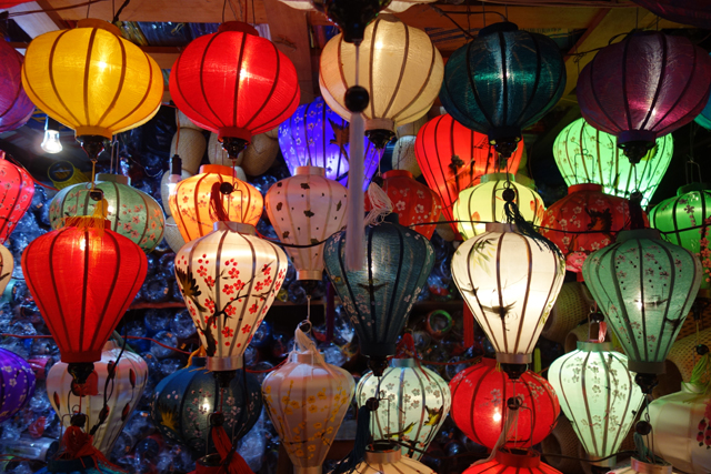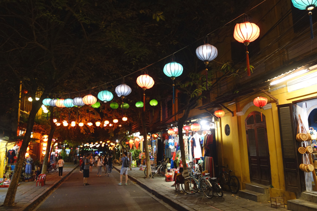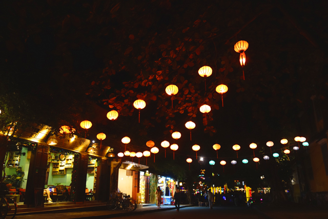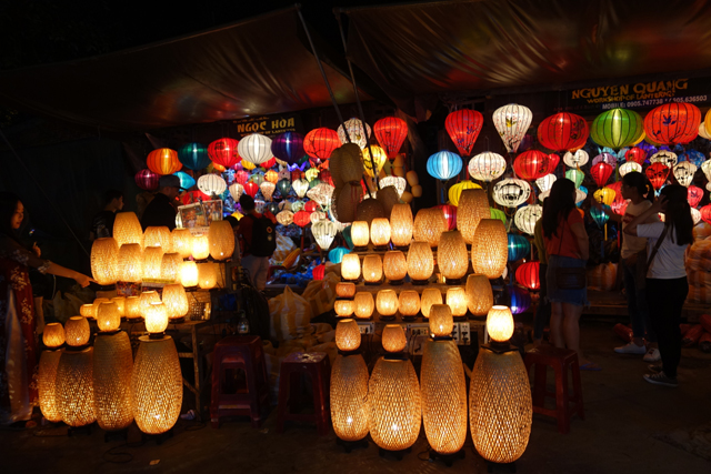 將河岸北區大致逛過後,我們越橋來到河的中島,這邊幾乎都是大餐廳跟酒吧,因此反倒顯得吵雜。尤其當中還設了夜市,即便很多小販都準備收攤,遊客仍川流著,不願歇息。夜市品項自不可能如主街文青店精緻,倒是有間燈籠店相當吸睛,能見一整區外型圓潤的典雅竹編燈,亦有彩繪過的紙燈,以水墨筆觸的花鳥屋閣,勾著觀光客流連挑選。不清楚有多少人最後掏了錢,這樣的體積,要全程帶著旅遊應該是真愛。