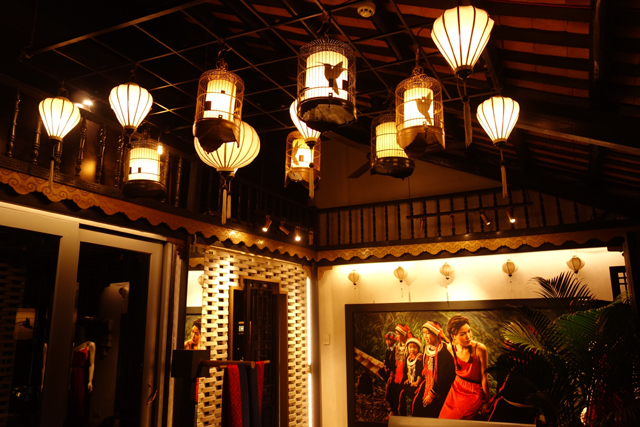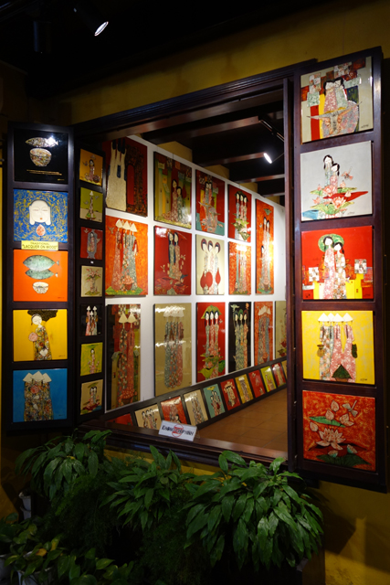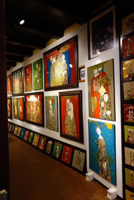 吃飽後一路穿回下午走過的主街,此時的「會安」果然換了風貌,夜色抹去那些雜亂的、斑污的,只許一盞盞燈籠點起斑斕。行於其間,莫名有種節慶氛圍,再加上觀光客少了許多,讓心情更加自在。店內賣品也變得撩目,尤其是那些畫廊,不小心又發現一間別致的,其人物多半細眉秀目,一區穿著奧黛已是繽紛,另區則致敬著以「吻」知名的「克林姆」,相仿構圖中,衣飾以碎金圖騰炫亮。只是光靠觀光客偶然的購買,它們真能長久生存下去嗎?相當存疑。