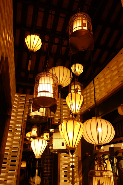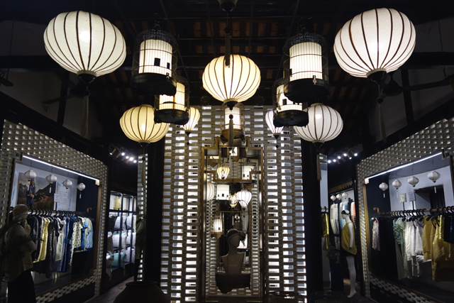 店員大概識破我們醉翁之意不在酒,特別指引了隔壁主打有機棉的姊妹店,說也有不錯佈置。好奇過去,門面設計的確相當近似,店裡則藏了個綠意庭園咖啡廳,棚架同樣諸多燈籠掛懸。且為了切合情境,燈面還投上了飛鳥剪影,若再添幾聲鶯囀,應該更仿真了。我來的真的是共產國家嗎?這根本是資本社會才有閒營造的情趣吧。